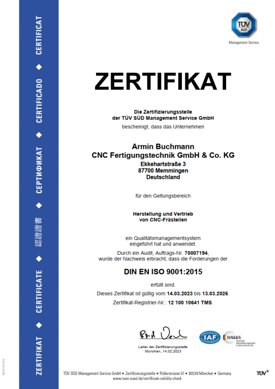 Qualitätskontrolle steht bei uns an erster Stelle. Die CNC Buchmann Fertigungsteile werden kontinuierlich während der Produktion geprüft. Optische und taktile Maß- und Oberflächenkontrollen werden mit High-End Messgeräten durchgeführt, um unsere TÜV – zertifizierten Qualitätsstandards zu sichern.